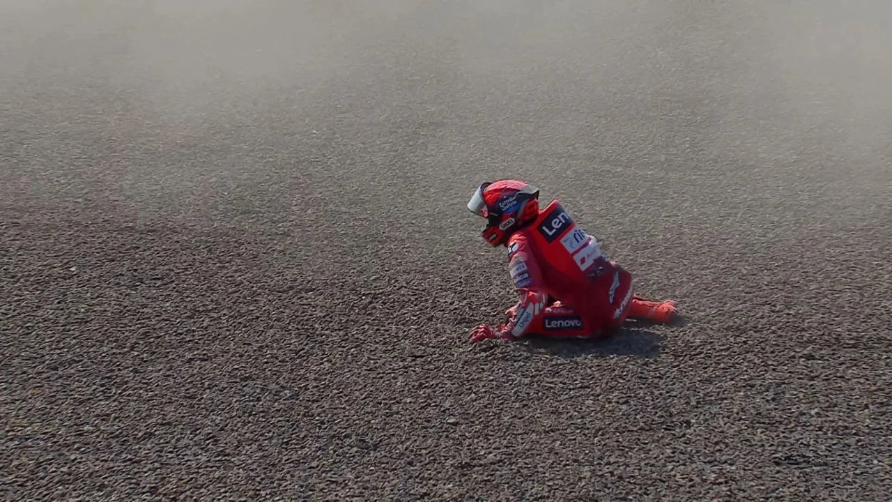 Start dari posisi kesembilan setelah akhir pekan yang penuh tantangan, Marquez sempat menemukan ritme positif saat sesi pemanasan. Namun, asa itu hancur seketika ketika Bezzecchi melakukan manuver agresif di Tikungan 7. Kontak keras membuat Marquez terhempas ke aspal, sambil menahan sakit di bahu kanannya.